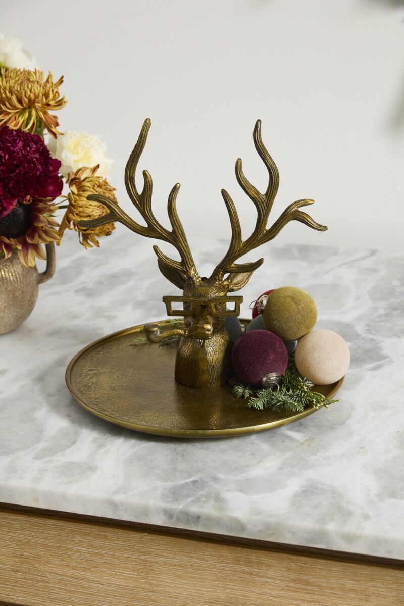 Bandeja redonda elaborada en aluminio con detalle de reno en el centro