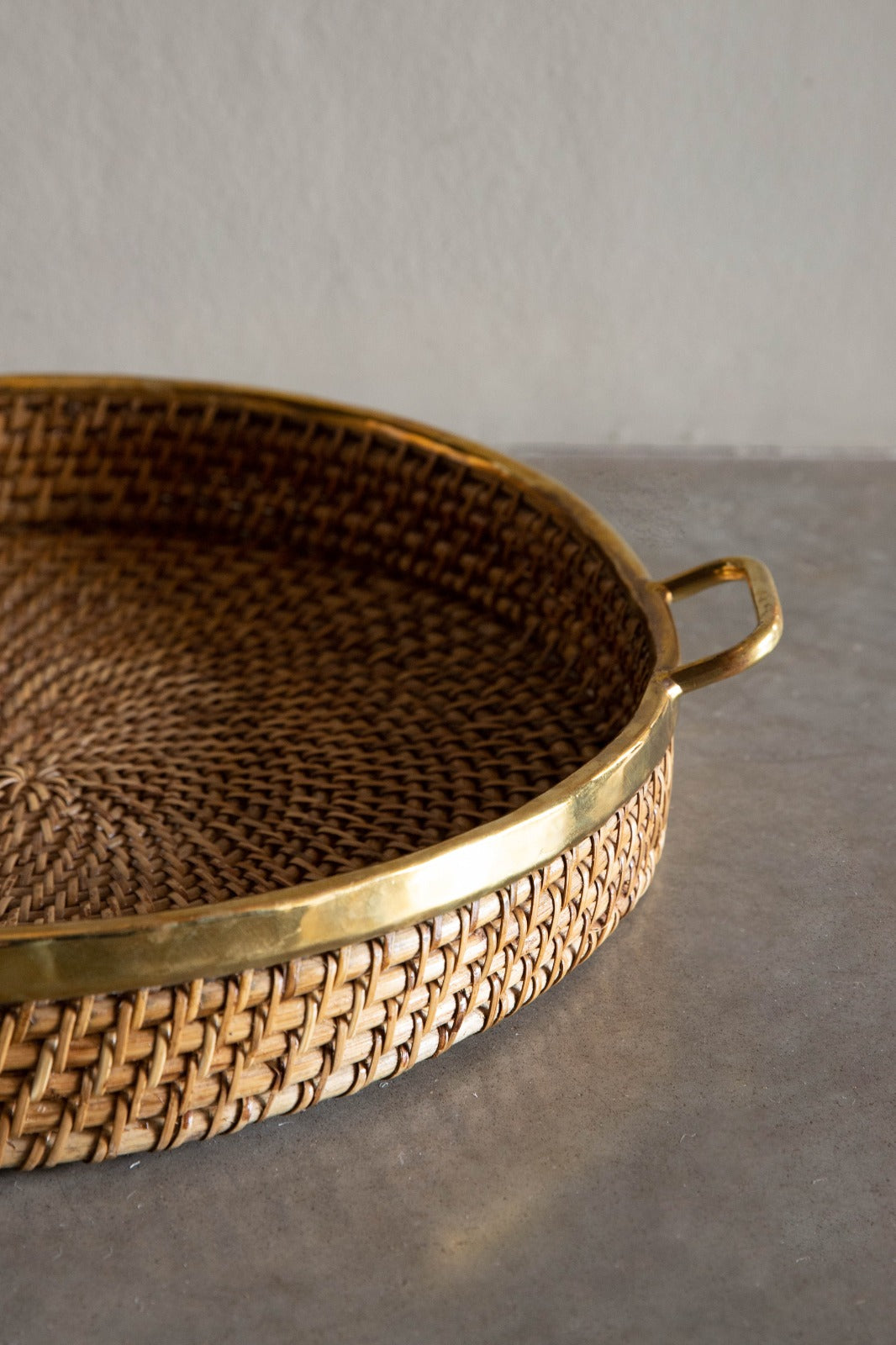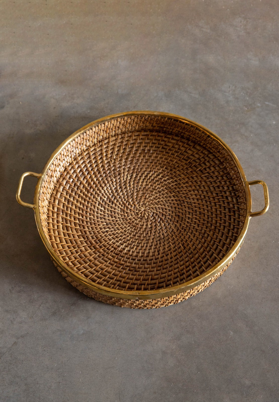Bandeja redonda tejida co acabado en color dorado en sus herrajes, ideal para servir la mesa o como decoración