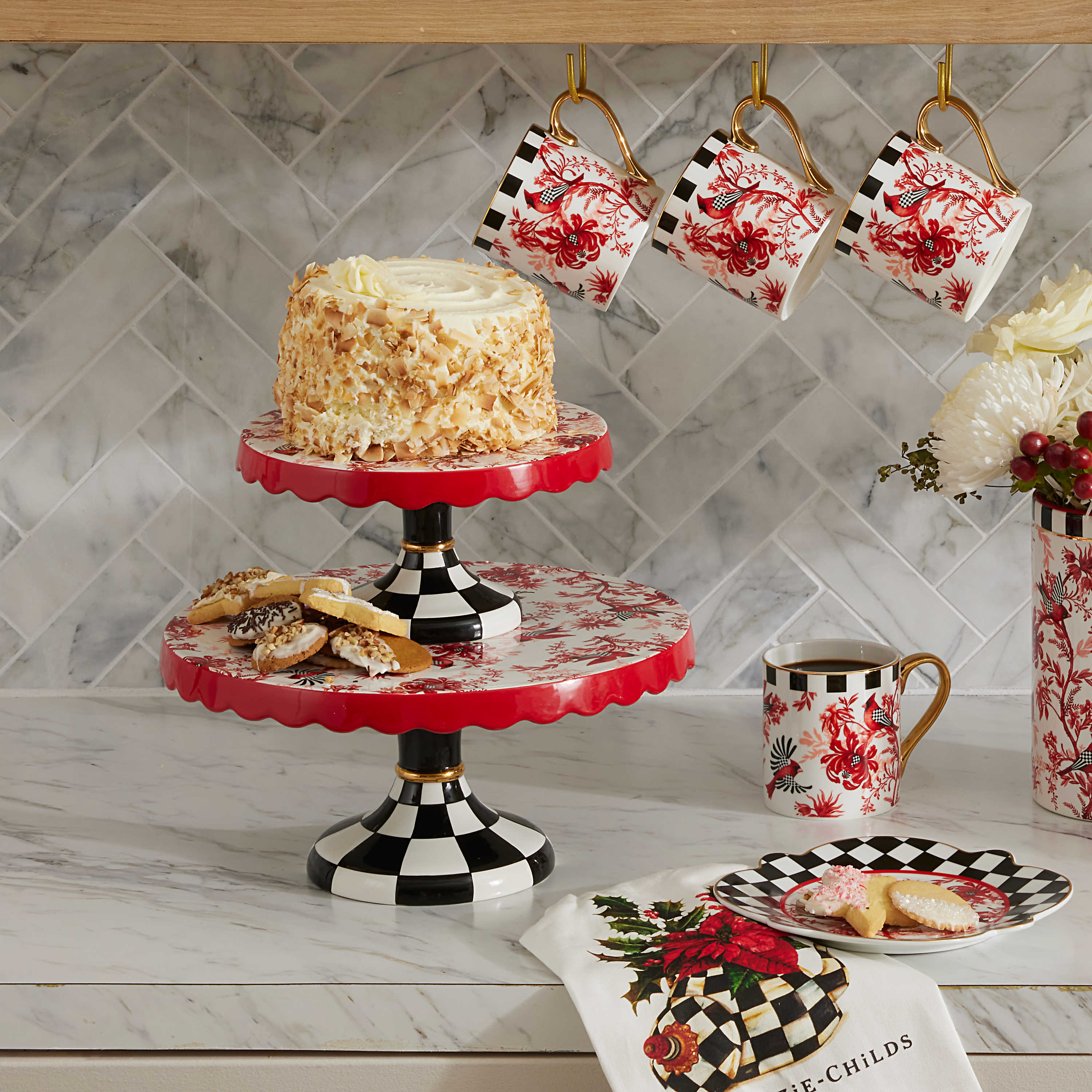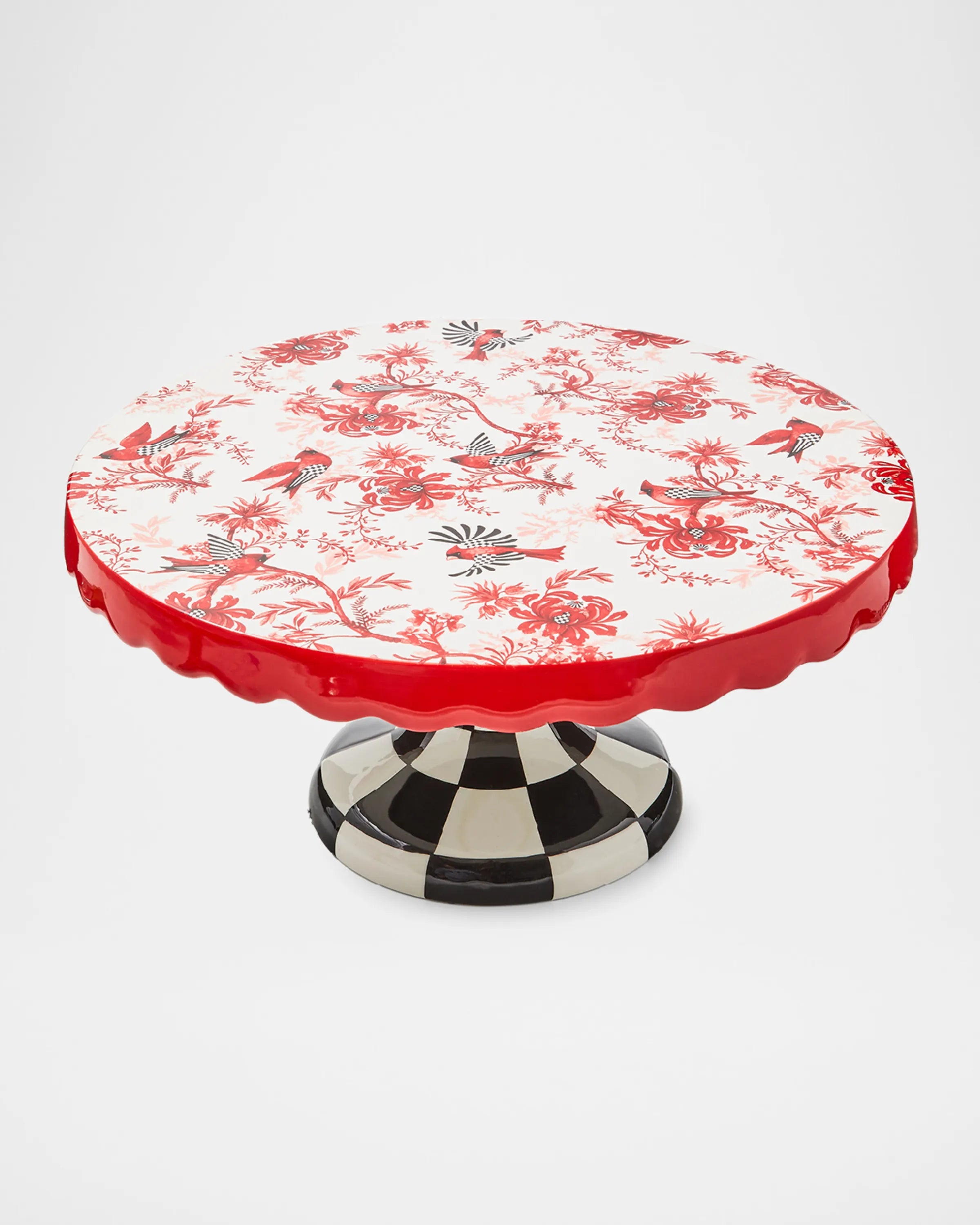 Plato de pedestal de cerámica que está decorado en la parte superior con un patrón rojo cardinal y floral toilet y se establece sobre una base de cuadros blancos y negros.