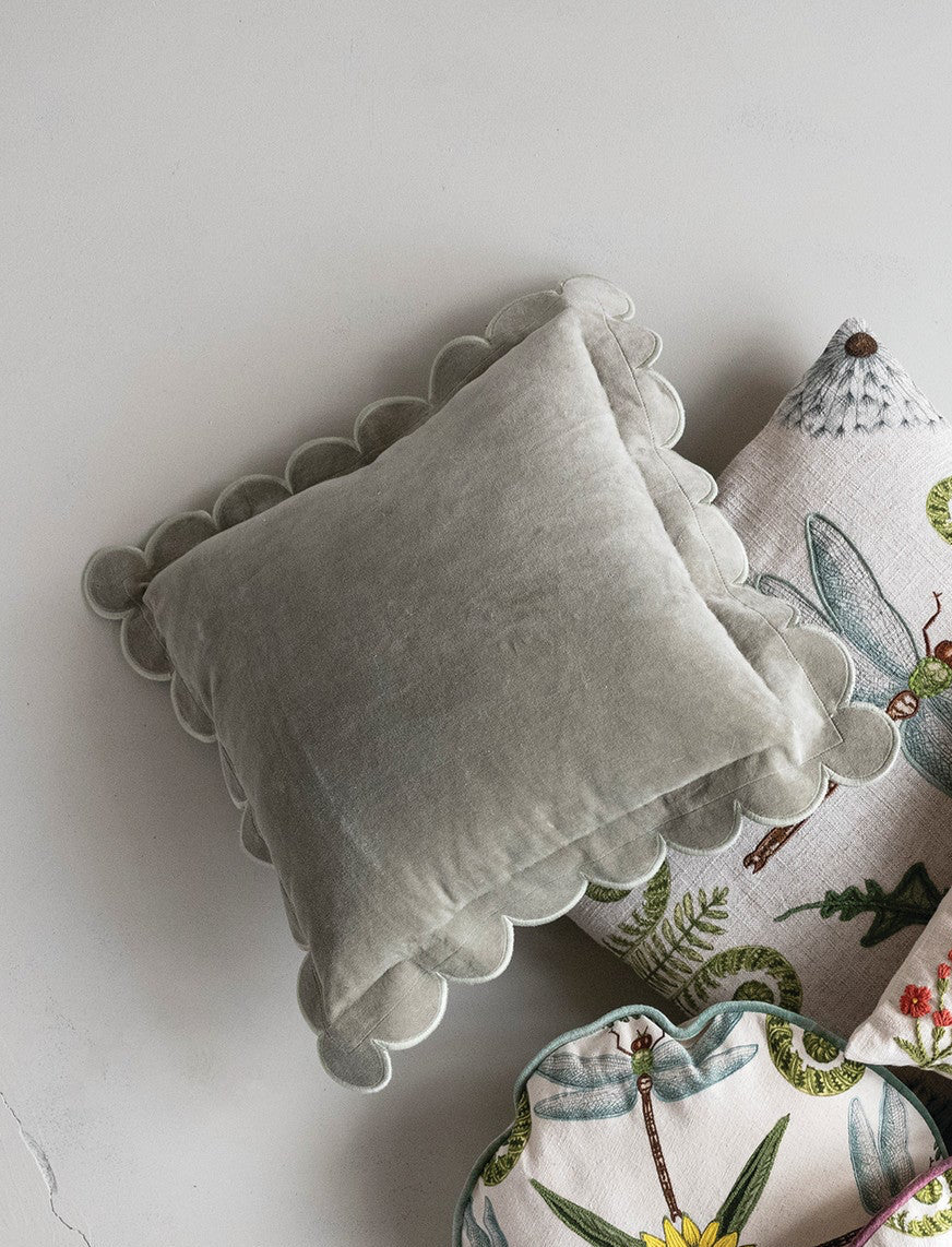 Cojín cuadrado verde elaborado en terciopelo de algodón con detalle en sus bordes en ondas, ideal para habitaciones, sofás, poltronas.