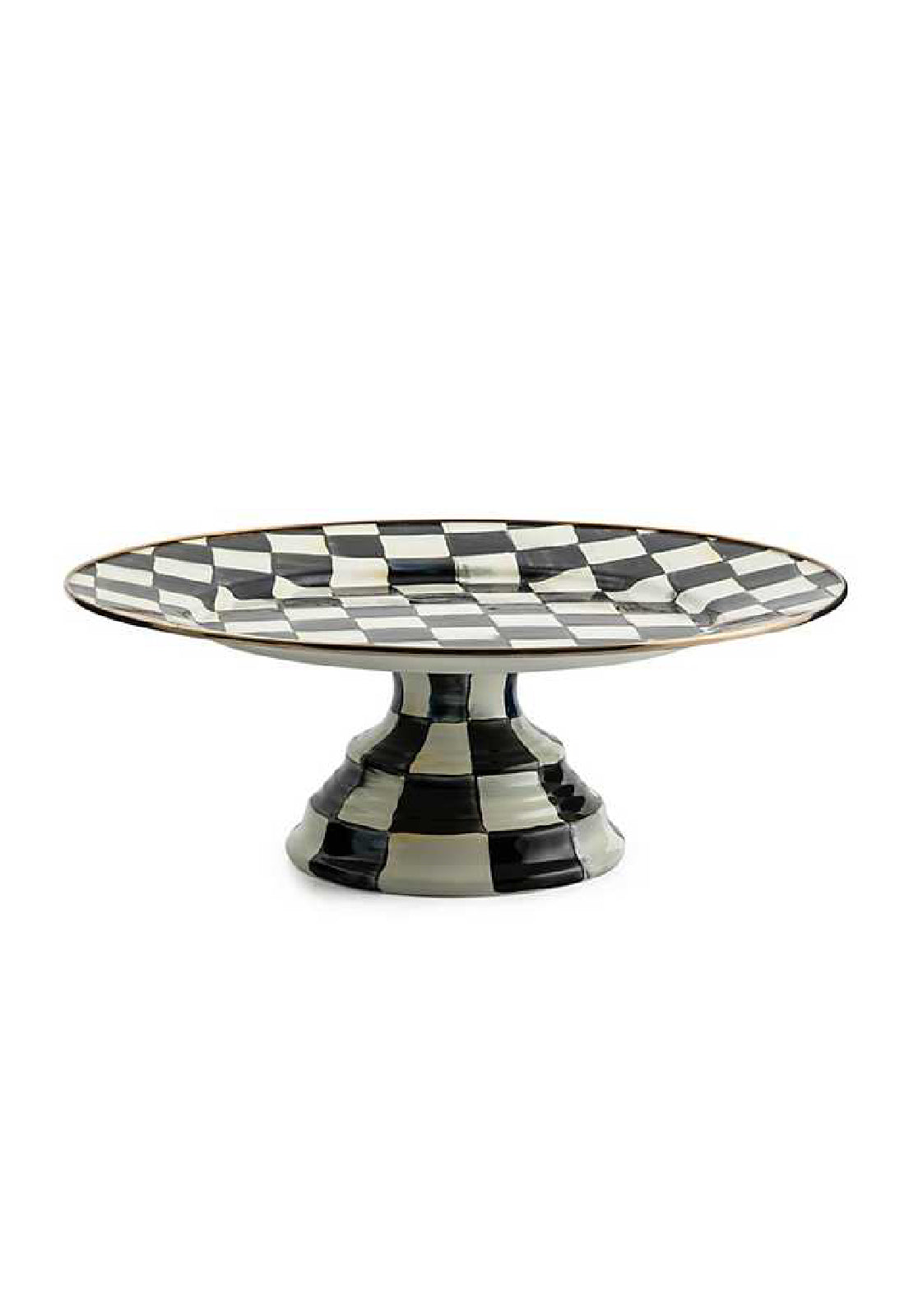 Dale a tus magdalenas y pasteles famosos la presentación que merecen. La bandeja con pedestal Courtly Check® tiene una base de acero esmaltado con borde de acero inoxidable bronceado. Una sutil paleta de tonos joya está tejida con el pincel de un artesano a través de los cuadros brillantes, pintados a mano y de alto contraste.