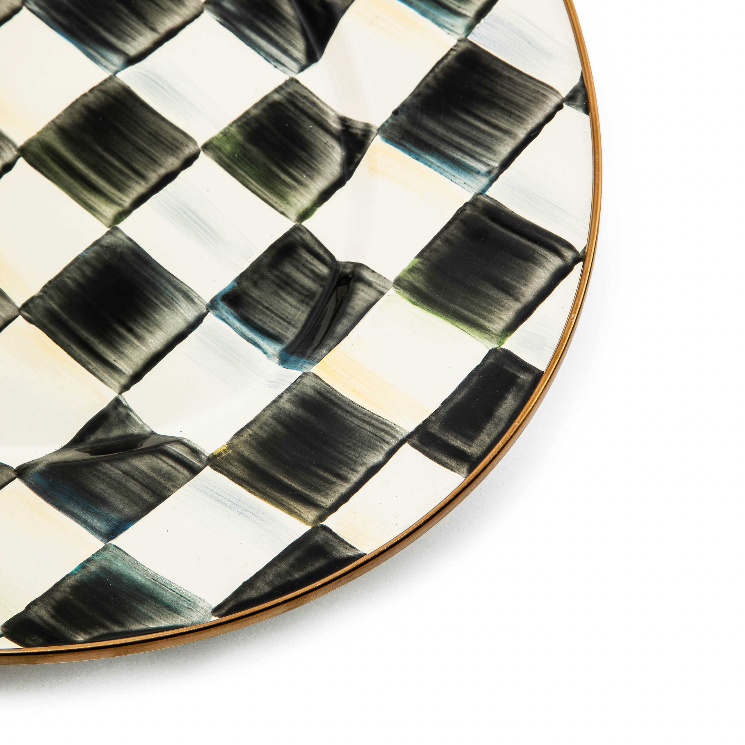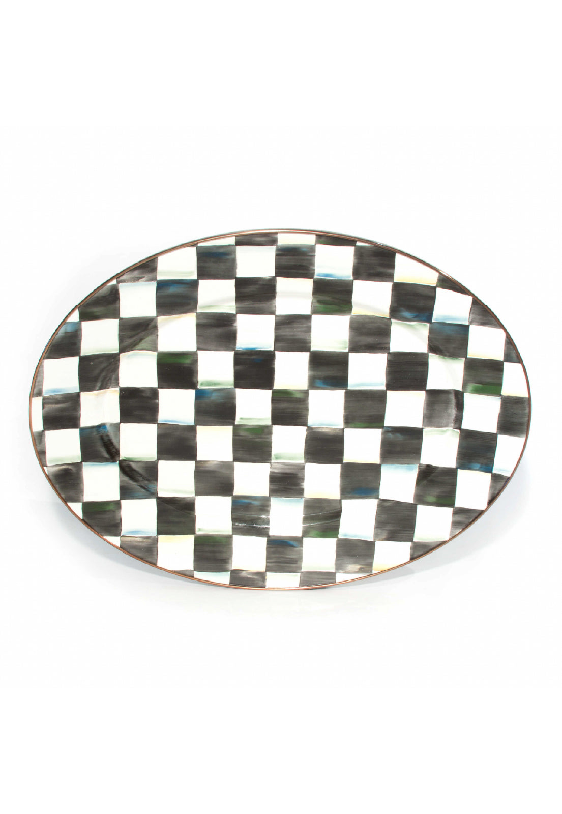 Un obsequio de bienvenida para el coleccionista de Courtly Check®, la bandeja ovalada esmaltada mediana de Courtly Check® es una excelente incorporación a la mesa de la cena o del bufé. Los cuadros pintados a mano revelan un espectro de colores de acento. Parte inferior de acero y borde de acero inoxidable bronceado.
