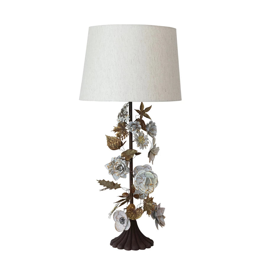 Lámpara de mesa metal vintage reproducción toelware flowers, con pantalla de lino e interruptor en línea, multicolor