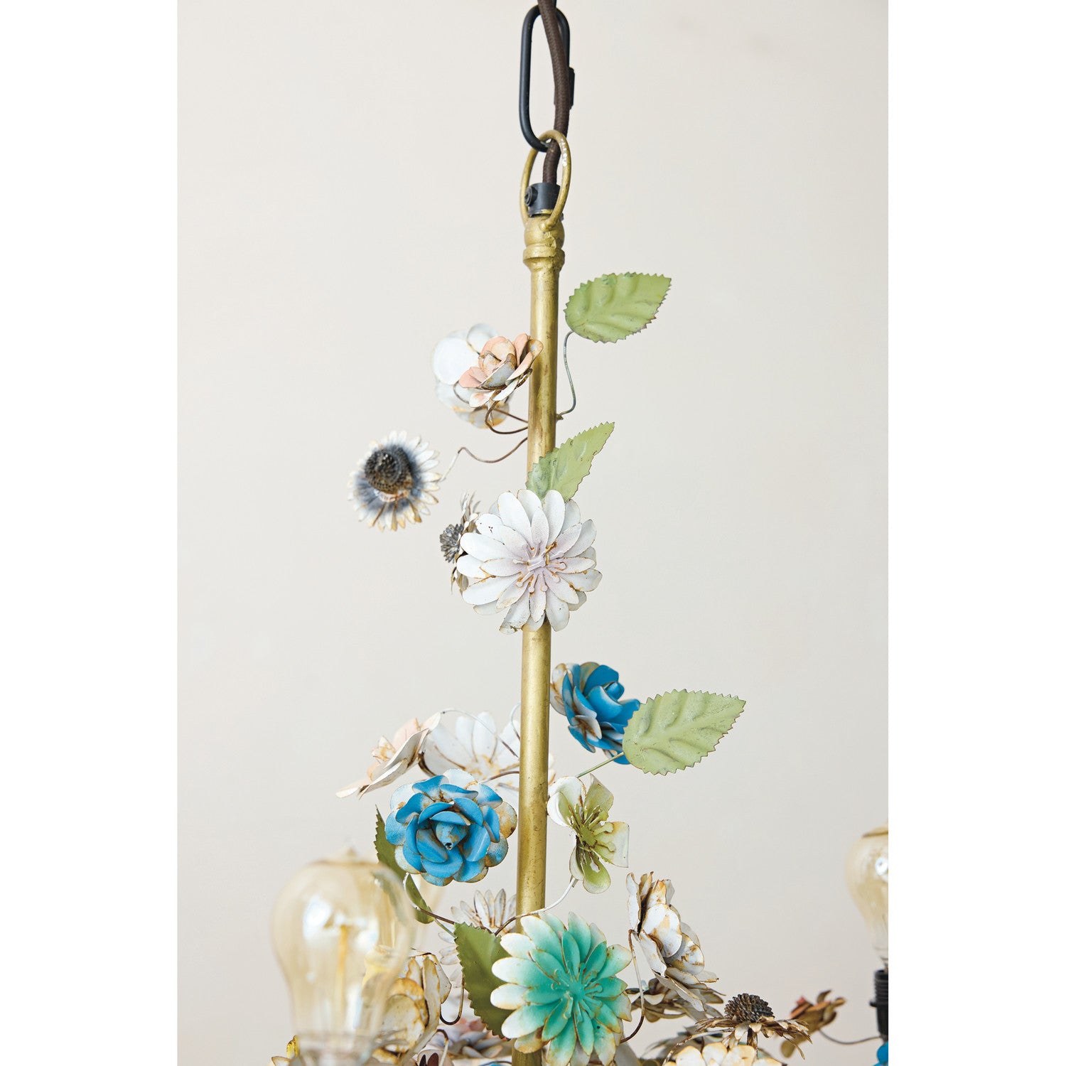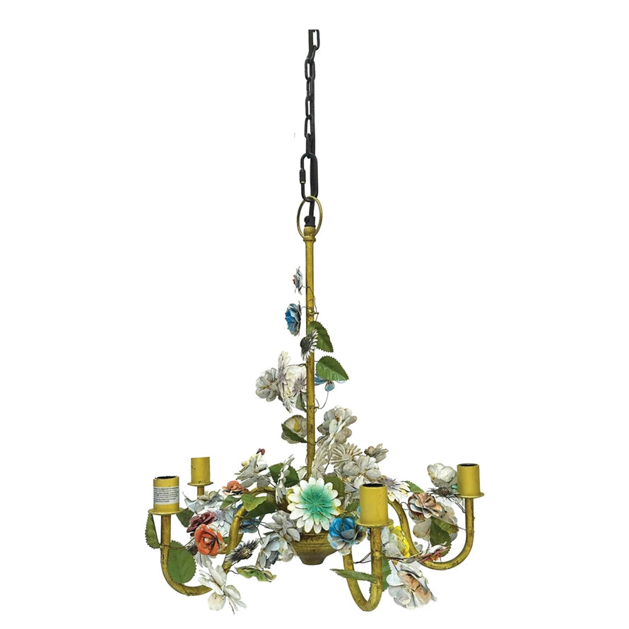 Lámpara de techo tipo chandelier 5 luces elaborada en metal con detalle de flores de colores