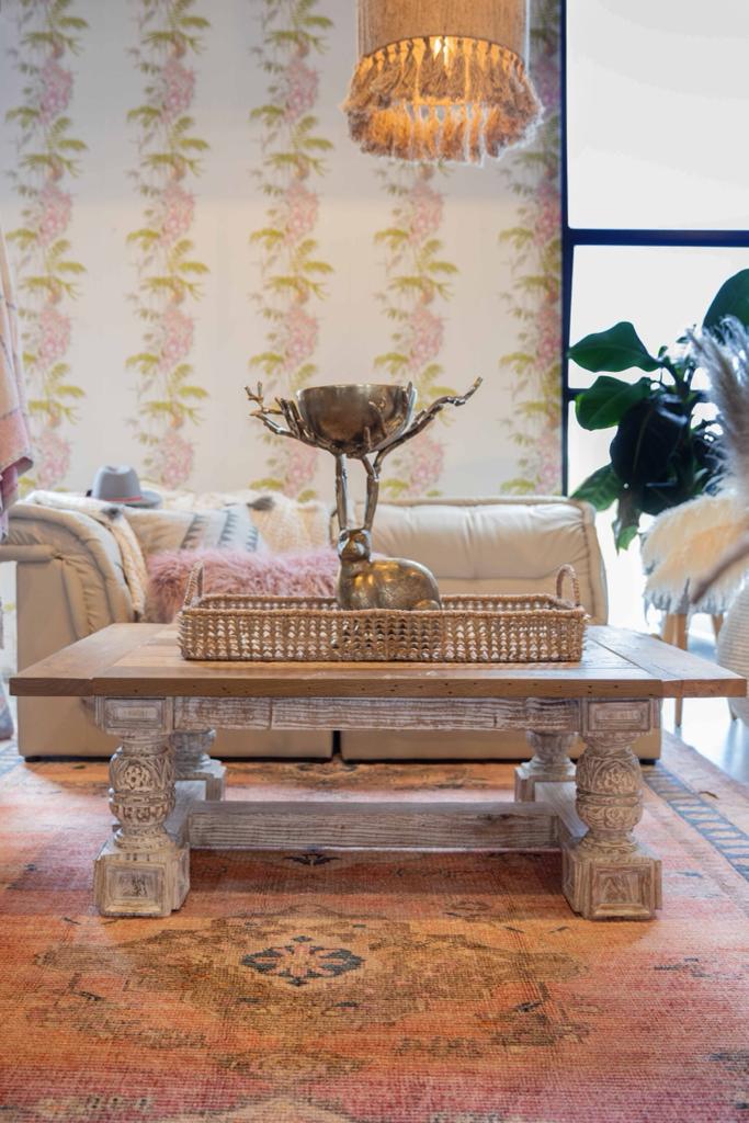 Mesa de centro rectangular elaborada en madera de comino con acabado rústico, base tallada en color blanco. Al ser un producto artesanal puede tener diferencias en sus colores, tonos de maderas, betas y acabados