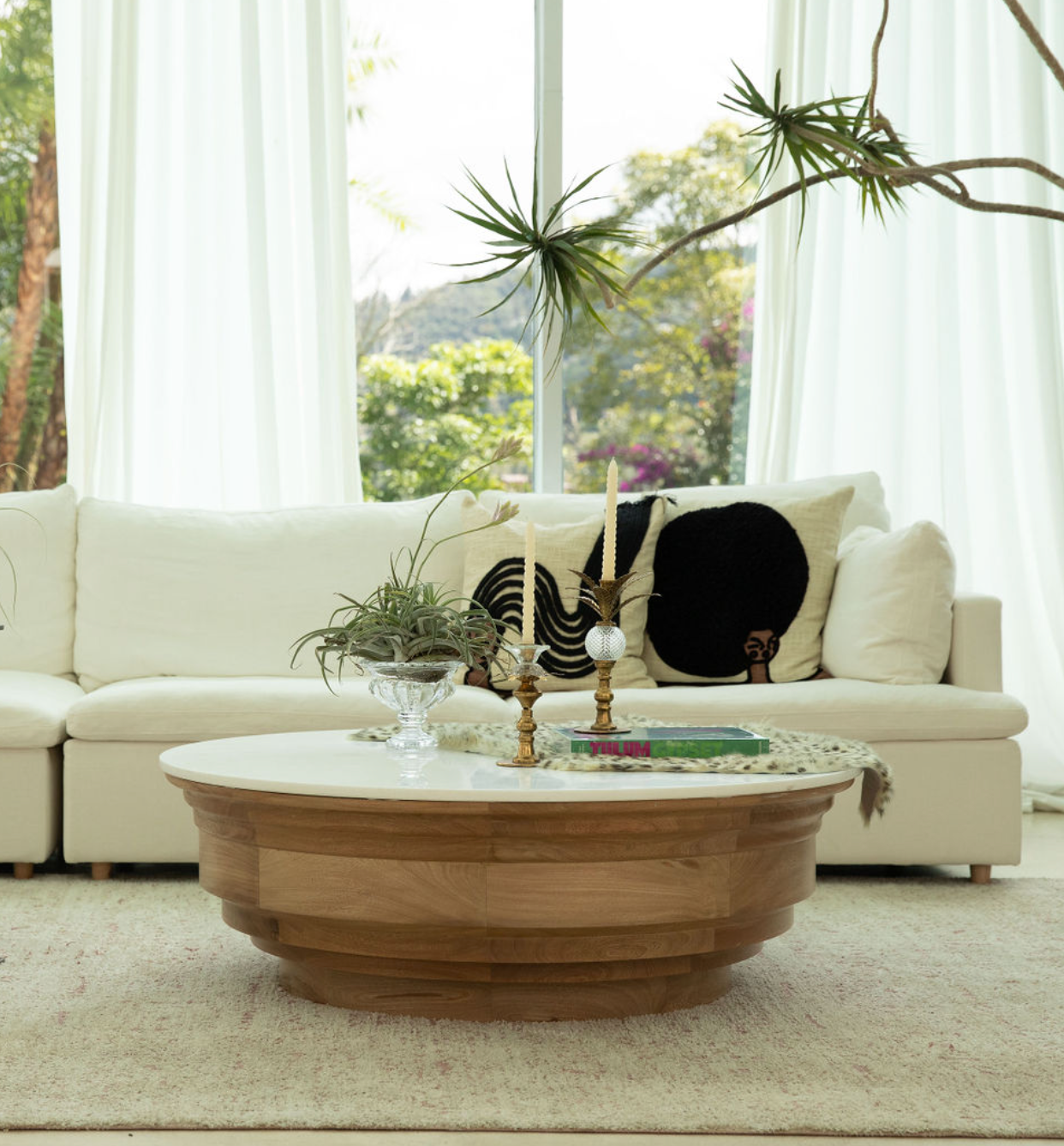 Mesa de centro redonda elaborada artesanalmente por locales en 100% roble con detalle tallado y tapa en mármol blanco