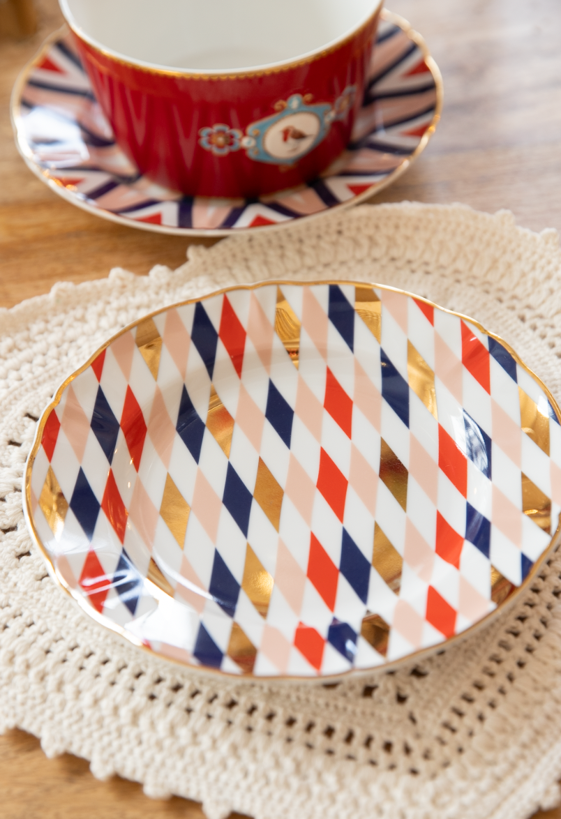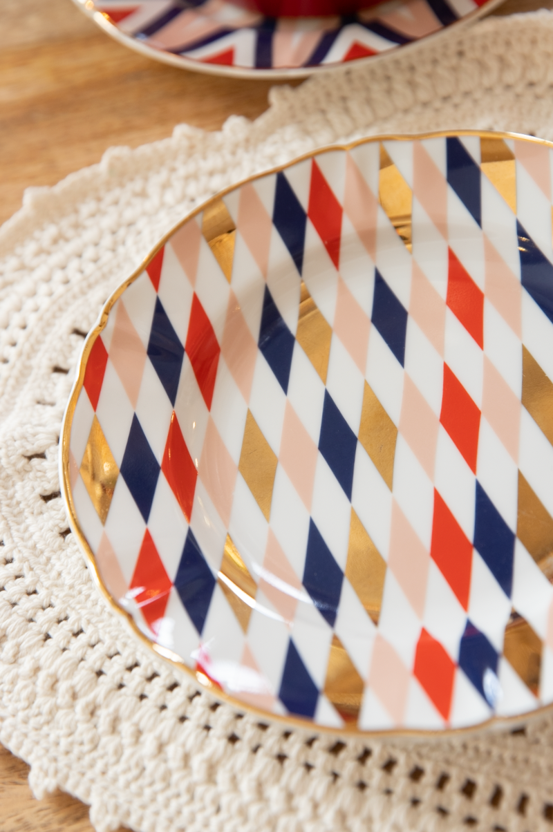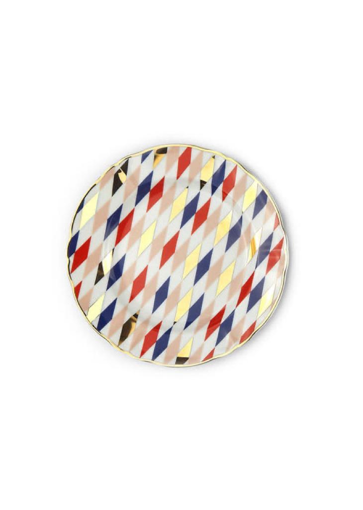 Plato fuerte arcano de Bitossi elaborada en 100% porcelana con detalles dorados en los bordes y centro en colores azules