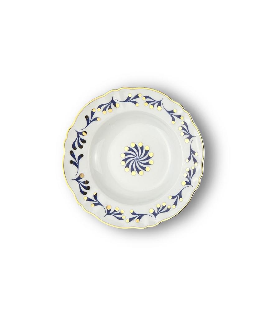 Plato postre arcano de Bitossi elaborada en 100% porcelana con detalles dorados en los bordes y centro en colores azules