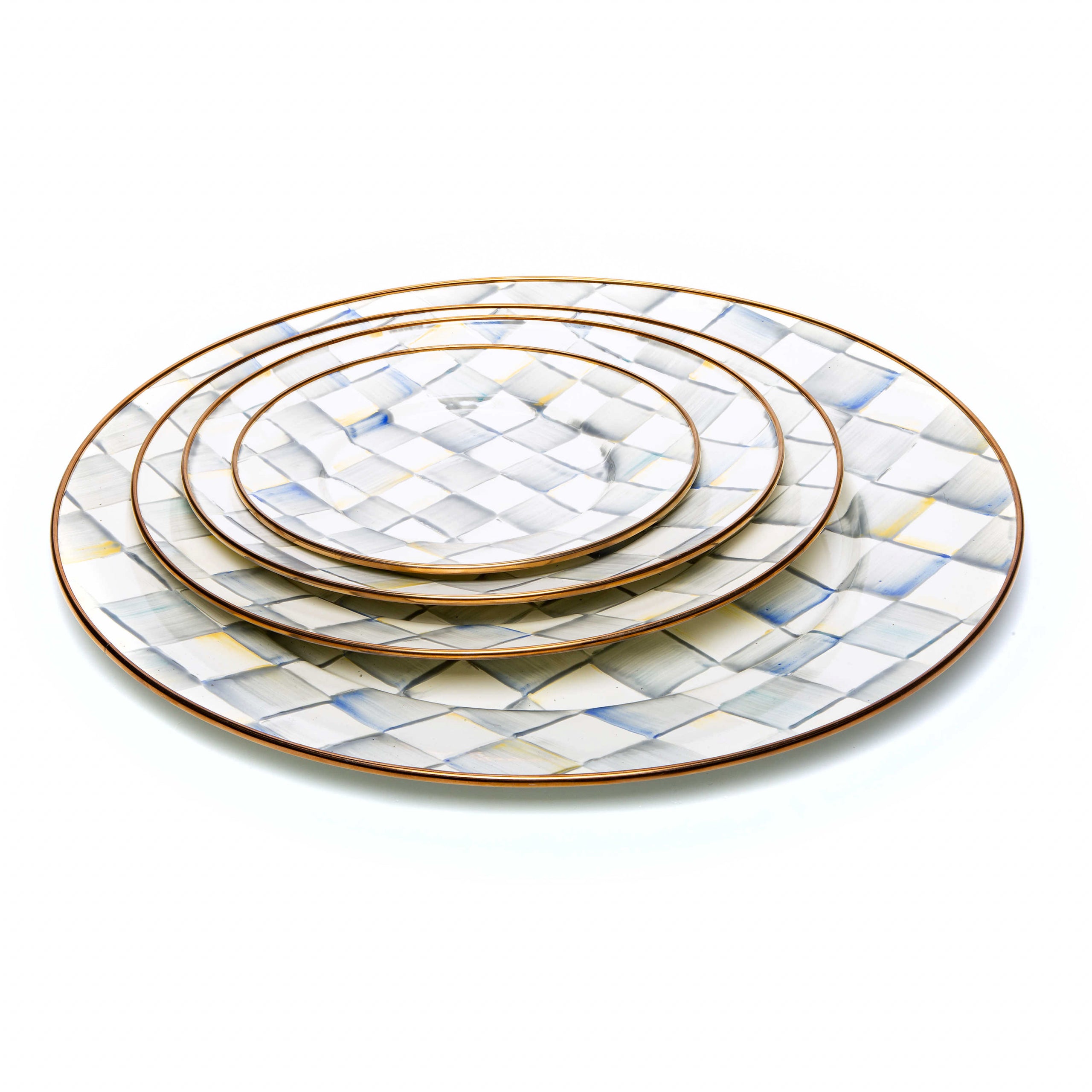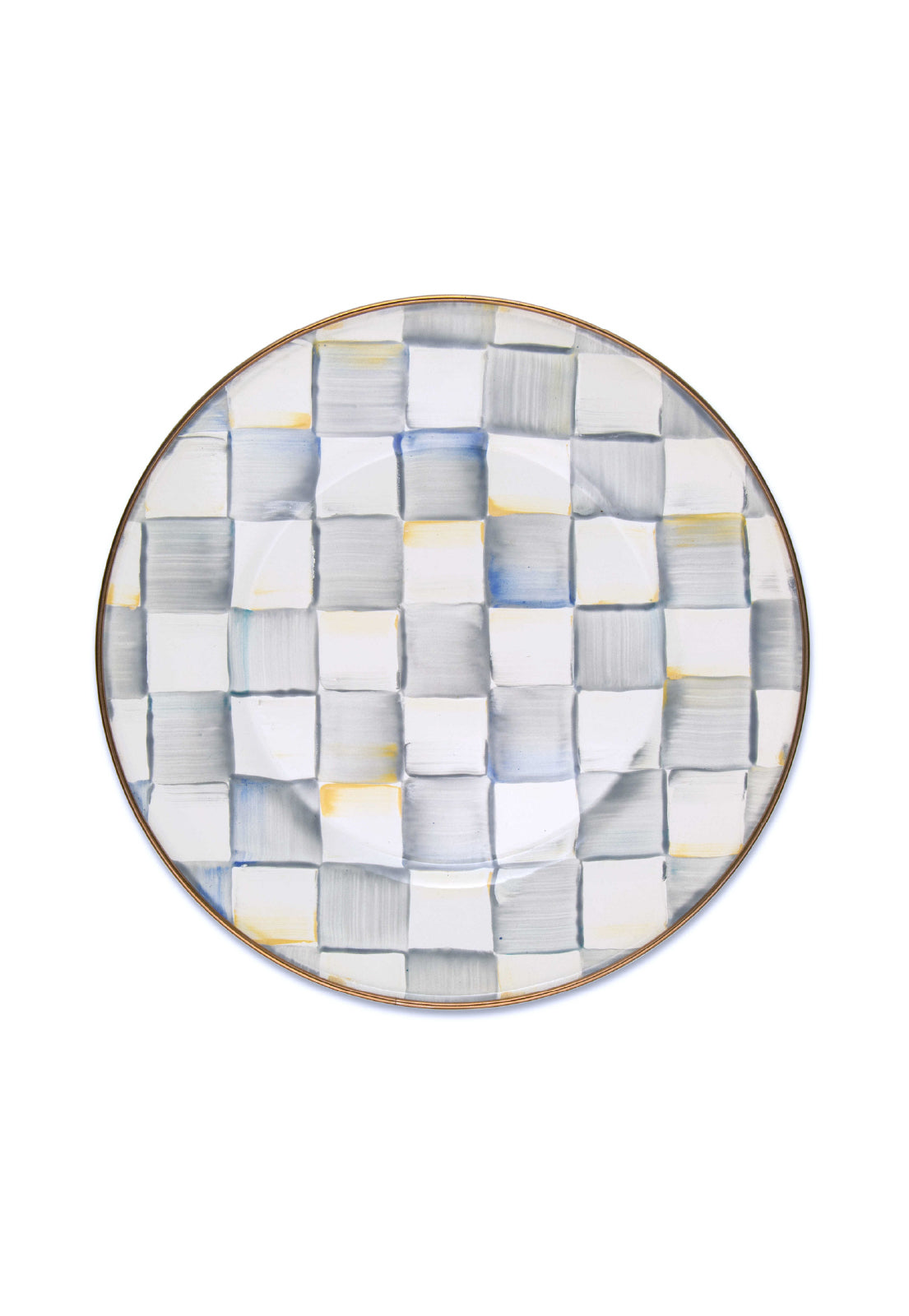 Prepare un lugar en la mesa para nuestro plato de postre o ensalada esmaltado Sterling Check. Con un tema similar al de nuestro patrón de esmalte Courtly Check®, Sterling Check cumple con todos nuestros requisitos. La parte inferior de acero de gran espesor está esmaltada con cuadros pintados a mano y de colores en sutiles tonos de gris y bordeada en acero inoxidable bronceado