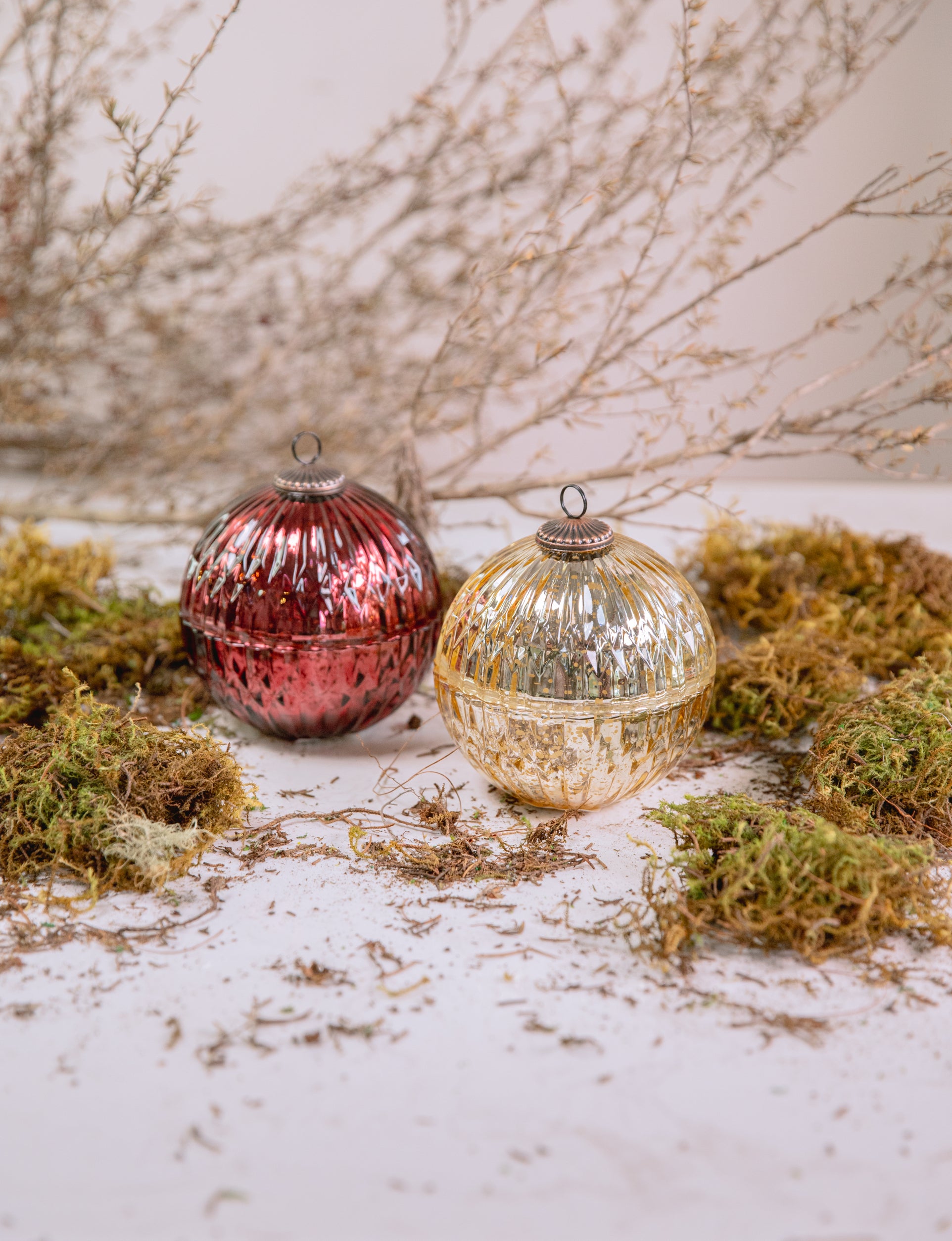 Vela navideña en forma de bola navideña con aroma a musgo de roble, eucalipto y canela, la vela encendida tiene duración de 32 horas