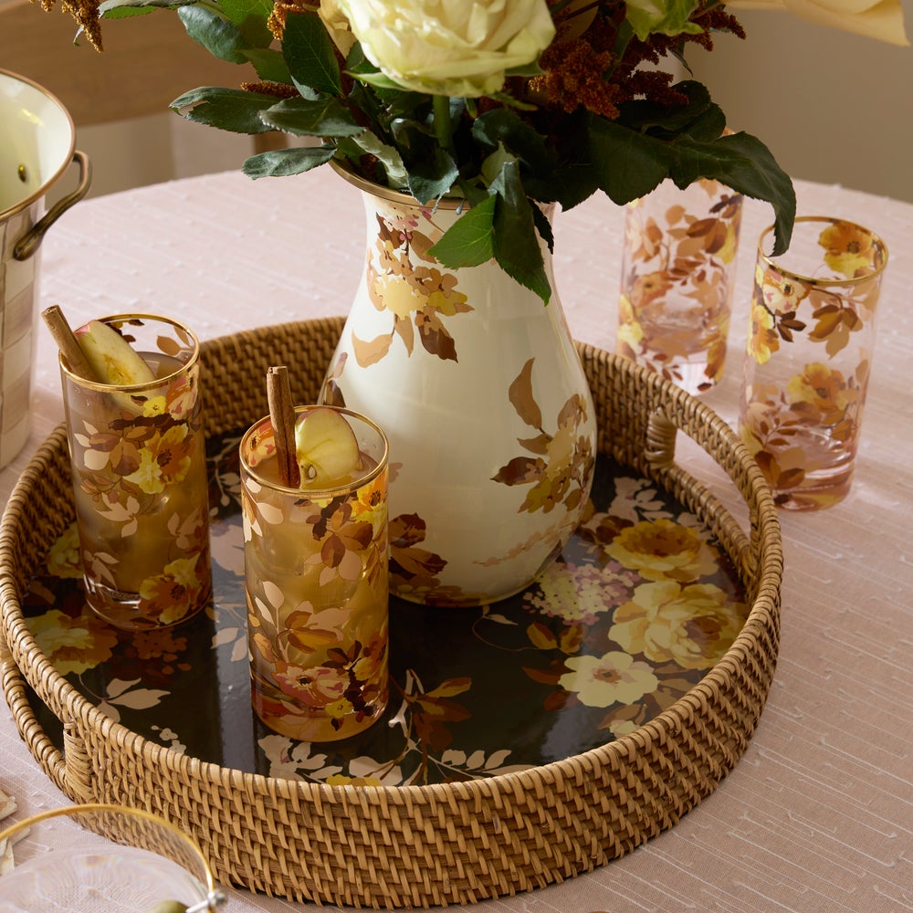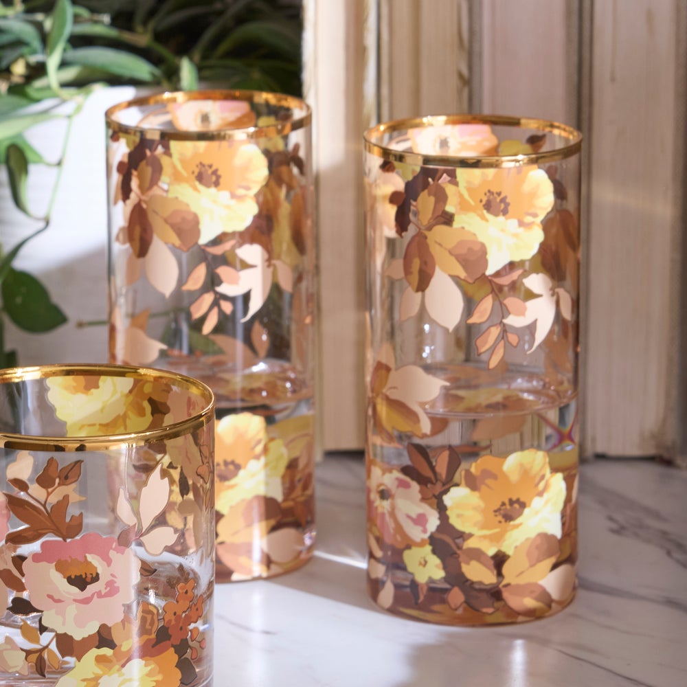 Haz que cualquier ocasión sea más especial poniendo la mesa con estas gafas Wild Rose Highball, que se venden como un juego de cuatro. Con nuestro diseño floral aplicado a mano, están adornados con brillo dorado.